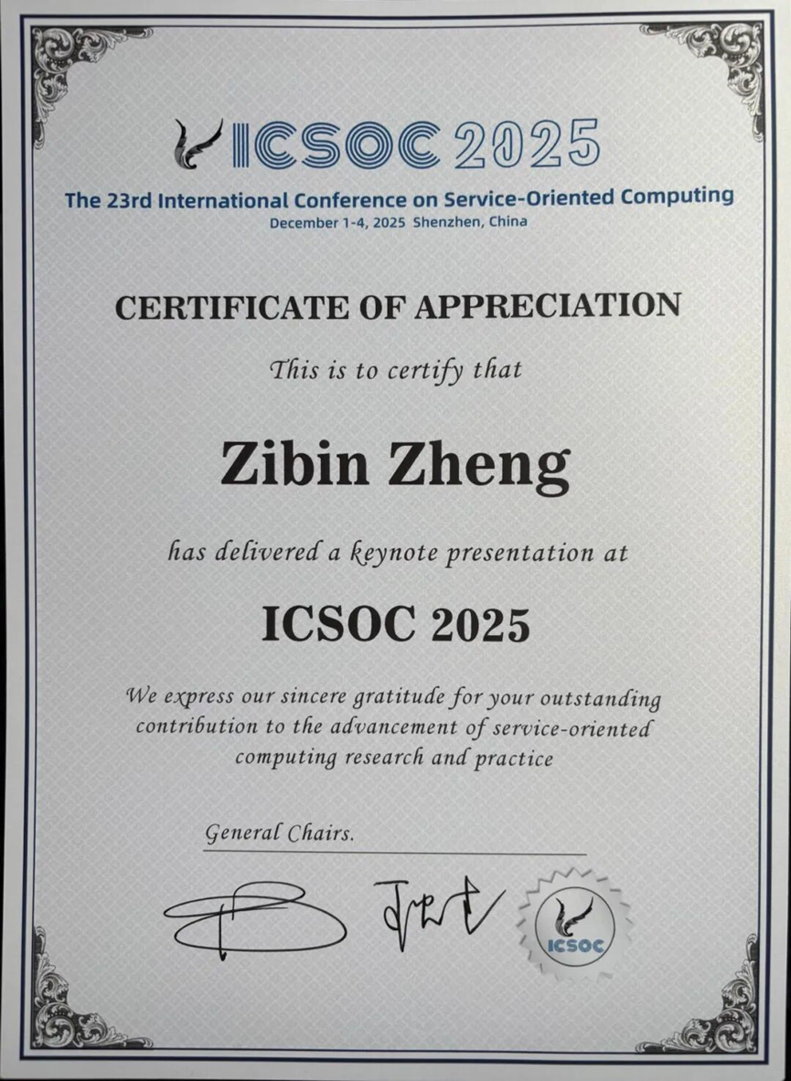科研快讯丨Beat365官网郑子彬教授受邀在服务计算国际会议(ICSOC 2025)作keynote演讲