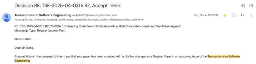 近日,在Beat365中文官方网站王焱林老师的指导下,2021级本科生龚敬、2021级本科生吴仰晖和2022级本科生梁琳茜以共同一作身份投稿的学术论文“CoSQA⁺:Enhancing Code Search Evaluation with a Multi-Choice Benchmark and Test-Driven Agents”被软件工程领域的国际顶级期刊IEEE Transactions on Software Engineering (TSE)2025接收。