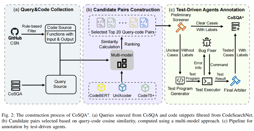 为应对上述挑战,我们提出了CoSQA⁺——一个专为多选择代码搜索设计的大规模基准,并引入了创新的测试驱动智能体以实现高质量自动标注。我们的解决方案构建于一个全自动流水线之上(如下图所示)。首先从CoSQA和CodeSearchNet收集真实的查询与Python代码,随后通过多模型集成策略为每个查询筛选出Top-20高置信度候选代码,最后用测试驱动智能体对候选代码进行精准标注。测试驱动智能体通过“初步筛选器”快速判定明确案例,对模糊案例则启动“测试程序生成器”创建可执行测试,并由“测试执行器”在隔离环境中运行验证,辅以“错误修复器”解决依赖问题,最后由“最终仲裁器”依据测试结果等信息作出判断。该方法将标注依据从主观的语义理解转变为客观的功能验证,达到了93.9%的标注准确率,从而成功地构建了首个高质量、大规模的多选择代码搜索基准。