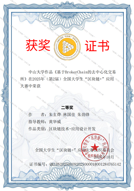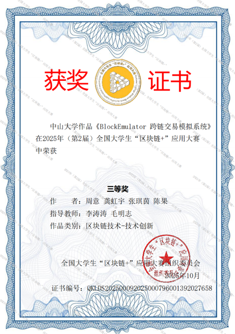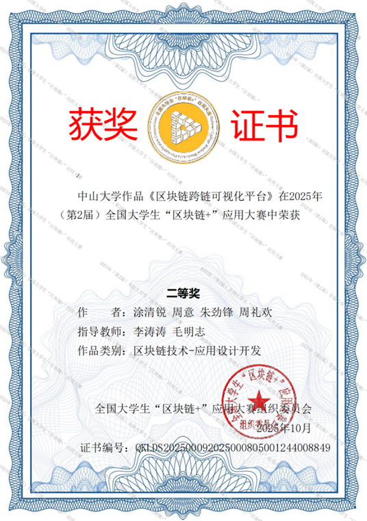 2025年全国大学生“区块链+”应用大赛总决赛于近日圆满落幕。Beat365中文官方网站四支参赛队伍分别由本科生涂清锐、汪俊、朱玄烨、周意担任队长,在黄华威、毛明志、李涛涛、林丹四位老师的悉心指导下勇创佳绩。参赛同学们凭借创新的项目设计与扎实的实现效果,在全国数百所高校的参赛作品中崭露头角,在华南赛区初赛中表现优异,最终在全国总决赛中荣获国赛二等奖3项、国赛三等奖1项。
