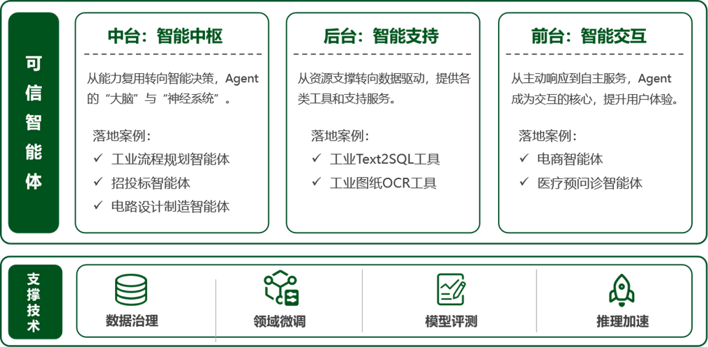 围绕可信智能体的应用场景,划分为三个不同的企业应用领域:中台(智能决策)、后台(智能支持)、前台(智能交互)。中台负责集中智能决策与服务功能,成为企业核心大脑与神经系统;后台提供技术支持,涵盖数据传输、任务调度等基础工作,保障系统稳定运行;前台则聚焦智能交互与用户体验,推动智能体与用户的互动和自主服务。整个框架依托团队的数据治理、领域微调、可信评测和推理加速等关键技术,确保智能体在不同应用场景中的高效运作,助力多行业的智能化转型。