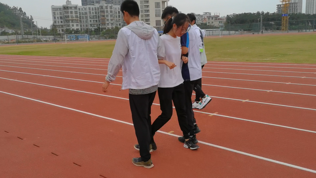 为3000m健儿喝彩后,我们又迎来了开心的3人4足项目,为了更加考验同学们的配合,我们将规则改为,3人最中间的一人必须与两边的人不同方向,一开始大家试走的时候,寸步难行,在搭上肩膀,喊起口号后,大家也渐渐配合融洽,乐在其中。