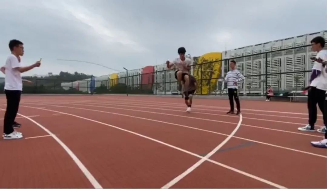 看完紧张的100m比赛,我们进入到了快乐的跳大绳环节。以趣味为主的5min跳大绳,由张恩、卜展鹏等同学组成的小队以128个取得了胜利。其中,我们看到某名“游戏黑洞”同学总是被绳子绊到,都笑得合不拢嘴,气氛非常的愉快。连旁边的观众席的同学也不禁拿起绳子跳起来。