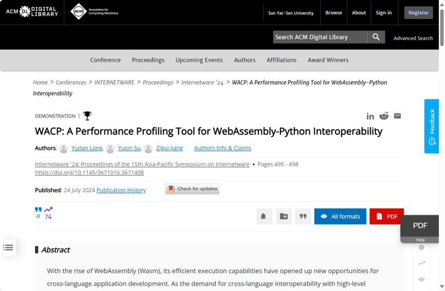 ★Yudan Long, Yuxin Su, Zigui Jiang. WACP: A Performance Profiling Tool for WebAssembly-Python Interoperability. Asia-Pacific Symposium on Internetware (Internetware), 2024