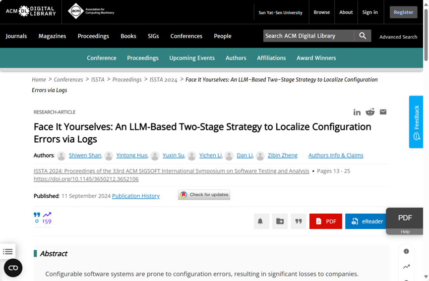 ★Shiwen Shan, Yintong Huo, Yuxin Su, Yichen Li, Dan Li and Zibin Zheng. Face It Yourselves: An LLM-based Two-Stage Strategy to Localize Configuration Errors via Logs. ACM SIGSOFT International Symposium on Software Testing and Analysis (ISSTA), 2024