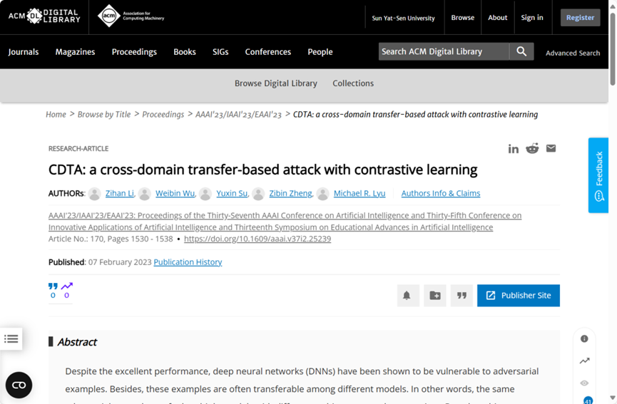 ★Zihan Li, Weibin Wu, Yuxin Su, Zibin Zheng and Michael R. Lyu. CDTA: Cross-Domain Transfer-Based Attack with Contrastive Learning. Thirty-Seventh AAAI Conference on Artificial Intelligence (AAAI), 2023