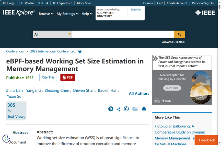 ★Zhilu Lian, Yangzi Li, Zhixiang Chen, Shiwen Shan, Baoxin Han and Yuxin Su. eBPF-based Working Set Size Estimation in Memory Management. International Conference on Service Science (ICSS), 2022
