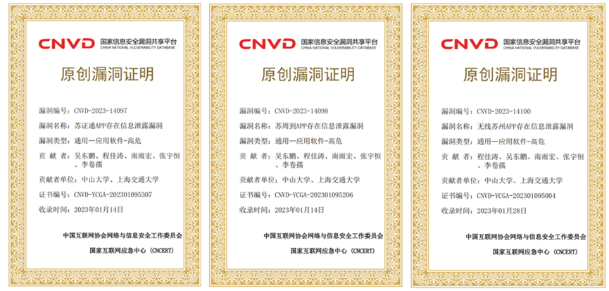 ● 漏洞发现及修复:获得国家互联网漏洞应急响应中心CNVD 15项高危漏洞确认。项目成员:吴东鹏、程佳涛。