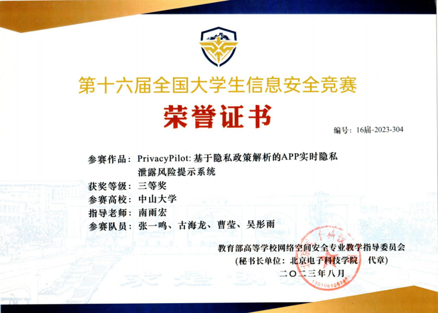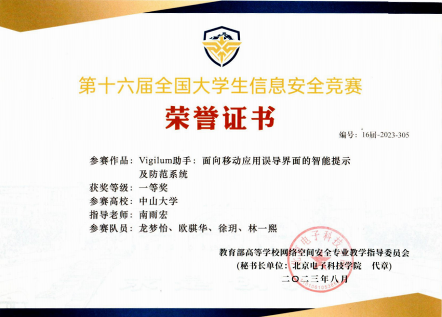 ● 2023 第十六届全国大学生信息安全竞赛 作品赛 一等奖 (我校首次)