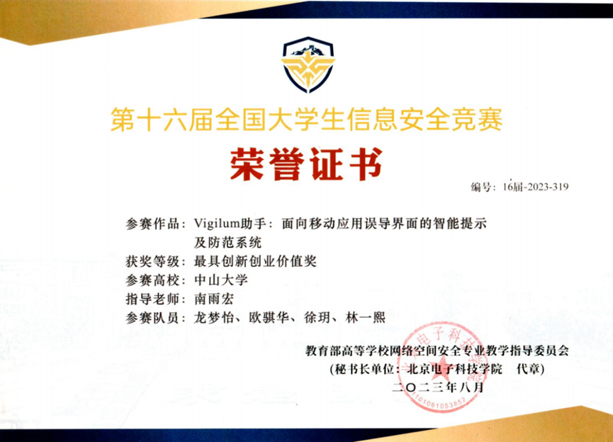 ● 2023 第十六届全国大学生信息安全竞赛 作品赛 最具创新创业价值奖 (我校首次)