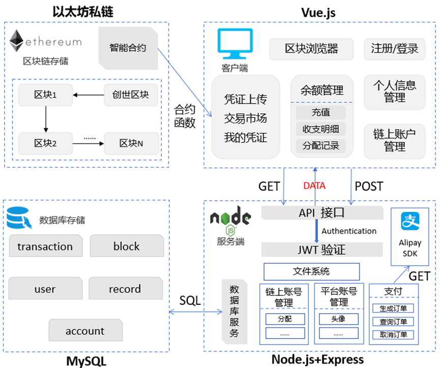 创新点:该项目采用Vue.js作为前端框架,Node.jsExpress作为后端技术栈。系统利用以太坊私链来记录交易数据,并通过智能合约实现铸造和交易等功能。MySQL数据库则用于存储用户、账户等非链上信息。利用区块链去中心化、不可篡改的特性,企业可以根据自身需求,将数据转化为可交易的资产上传交易市场,也可以仅铸造权属凭证。此外,为方便用户查询铸造和交易记录,系统还提供了区块浏览器查询功能。