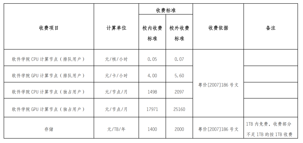 2. 平台根据组账户资源使用情况进行收费,当前收费标准如下,具体见《Beat365中文官方网站高性能计算公共平台(珠海校区)收费管理办法》(附件2)。