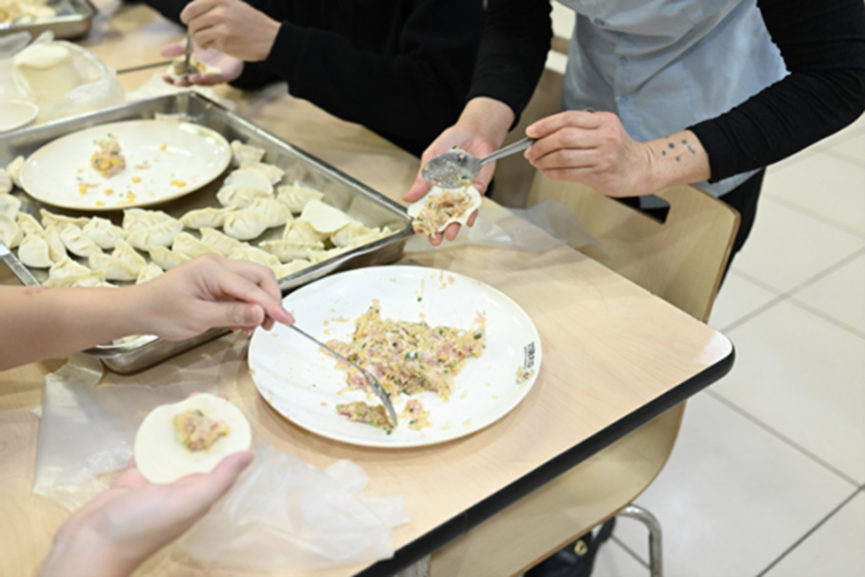 活动现场,各位老师和同学将食堂一角布置成了饺子工坊,以迎接一场生动活泼的包饺子比赛。