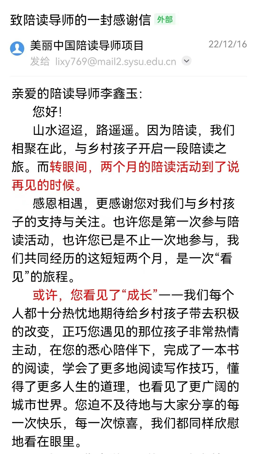 美丽中国陪读导师项目给李鑫玉的感谢信