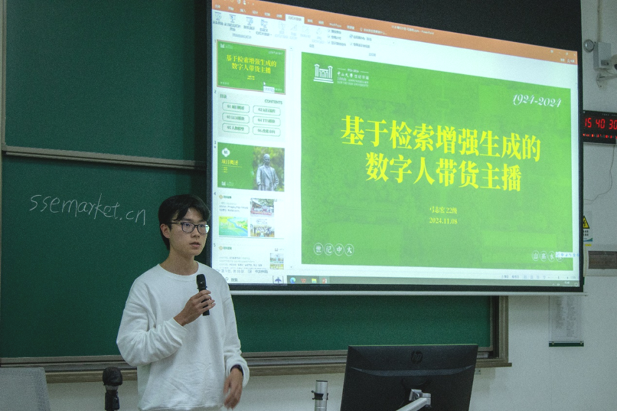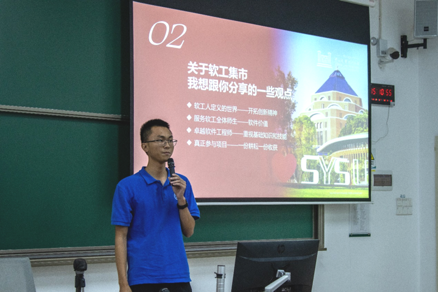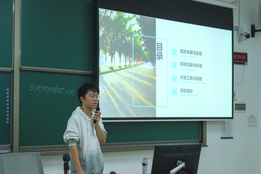 “SSE-Market”(学院学生自主信息交流平台)项目团队负责人吴仰晖给新生详细讲解了项目从需求调研、产品设计到落地实现的全过程。他介绍了团队如何通过技术手段解决师生信息差问题,并实现师生资源共享,形象展现了团队协作和技术创新在解决校园实际问题中的价值。