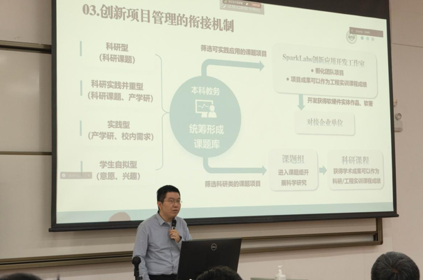 苏玉鑫副院长围绕学院本科生创新能力培养体系建设,介绍了学院本科生培养体系架构、创新项目管理的衔接机制、学生参与创新项目指引等方面内容。他提出学院未来将提供给本科生两条课程路线:工程实训和科研课程,学生可以根据个人兴趣进行选择,最终成果可用于课程项目展示或毕业论文撰写。他还强调了大模型技术在软件工程领域应用的必要性,鼓励同学们钻研并掌握前沿技术。
