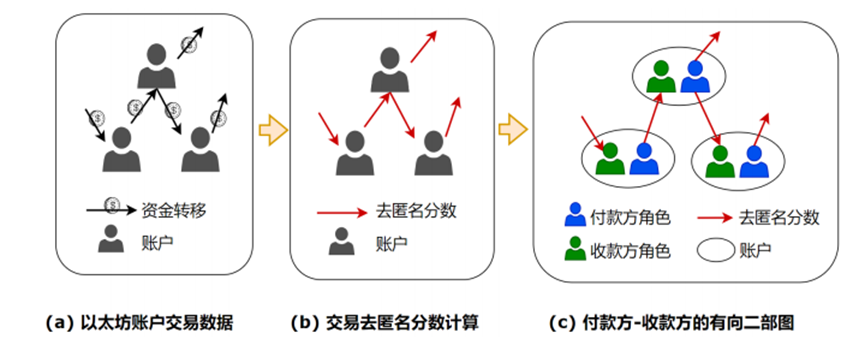 (2)数据预处理:对原始交易数据进行分步处理,先计算去匿名分数,再构建有向二部图(即支付者-收款者网络)。