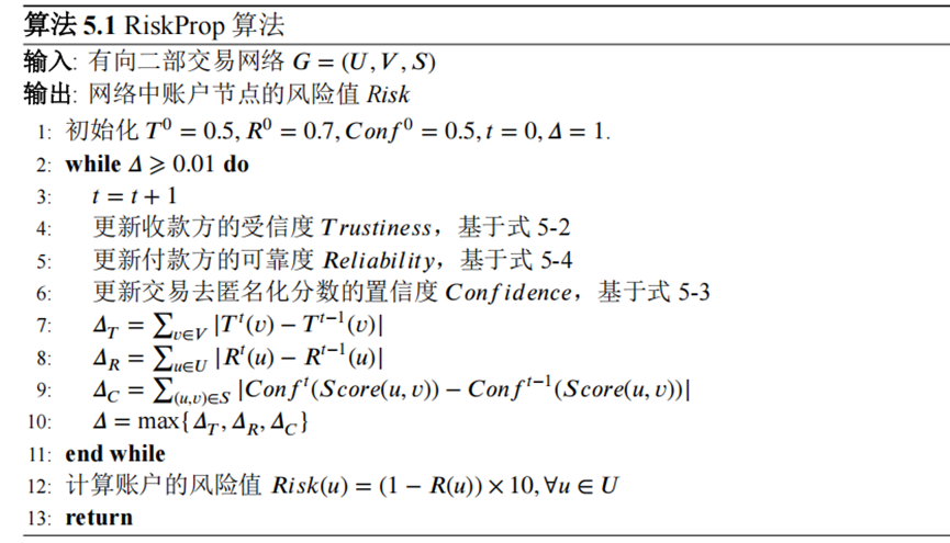 RiskProp网络传播算法的主要思想是通过构建的有向二部图,利用定义的去匿名分数及基于五项公理的网络传播机制,迭代更新每个账户的可靠度、受信度和置信度,当这些指标的变化量小于设定阈值时,算法停止迭代,从而实现对账户风险的精确评估和非法活动的有效识别。在此过程中,算法综合考虑了交易双方的历史行为及其在网络中的相互影响,确保评分能准确反映各账户的实际风险水平,每个事件的迭代收集过程详见论文。其伪代码如下: