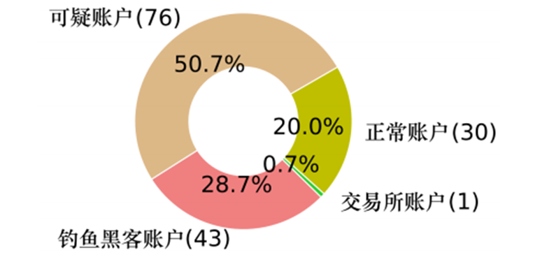 我们发现,许多非法账户在标签库之外,仍然被认为是无风险的,却能被RiskProp准确识别并揭露,如上图所示。这一现象说明了风险评级相较于现有的非法账户分类研究的重要性:通过交易传播,可以识别更多的高风险账户,即使这些可疑账户尚未被列入黑名单。这对以太坊的安全至关重要,此外,新发现的非法账户可以丰富当前的标签收集,以供进一步分析。