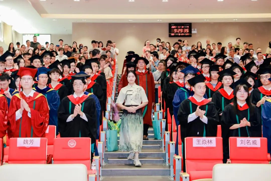 陈征宇书记、郑子彬教授、余阳教授、王若梅教授、吴嘉婧教授、黄华威教授、苏玉鑫副教授7位老师上台,与学院2025届毕业生亲切握手,并赠送给大家毕业纪念品。意气风发的毕业生们上台接受学院最诚挚的祝福,并向主礼教授及嘉宾鞠躬致谢,感谢求学过程中老师们无私的教导;向台下的家人朋友们致谢,感恩亲友们的默默支持与奉献。