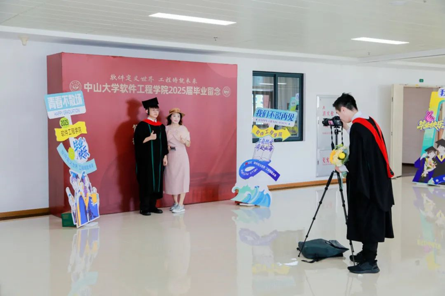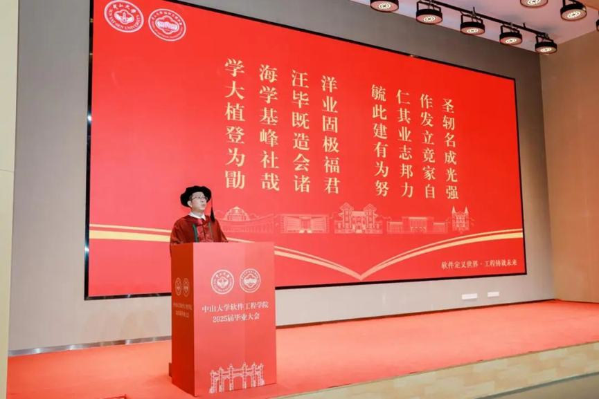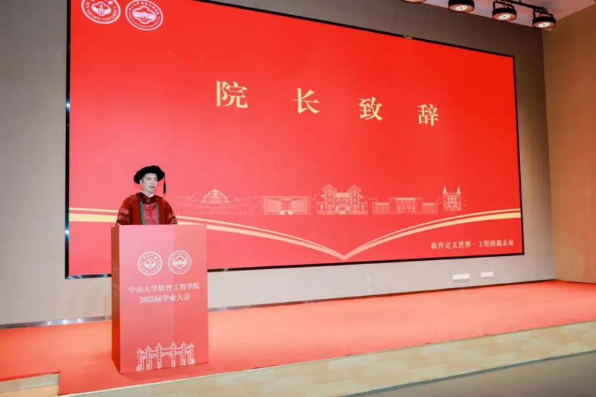 纪念品颁发仪式完毕,陈征宇书记作毕业寄语。他指出软件工程作为连接技术与创新的桥梁,不仅是代码的编织,更是梦想与现实交汇的艺术。在同学们即将踏入一个被人工智能深度重塑的时代之际,他向各位毕业生送上四点寄语:博学笃行,创新求变;肩负责任,心怀担当;团队协作,多元整合;情系康乐,万里同心。希望同学们铭记“为社会福,为邦家光”的使命,保持中大人“敢为天下先”的锐气与“笃行实干”的担当,在各自的领域发光发热,做时代浪潮的奋进者。最后,陈书记向同学们展示了由学院陈文清老师指导弓志宏、罗政杰、汪俊等学生,运用AI技术创作的歌曲MV,祝各位毕业生“零壹相生,码到功成”。