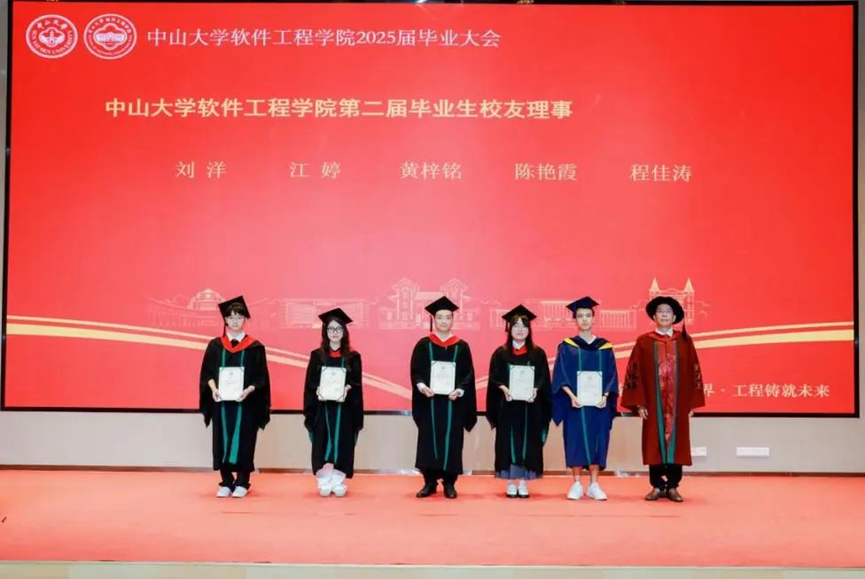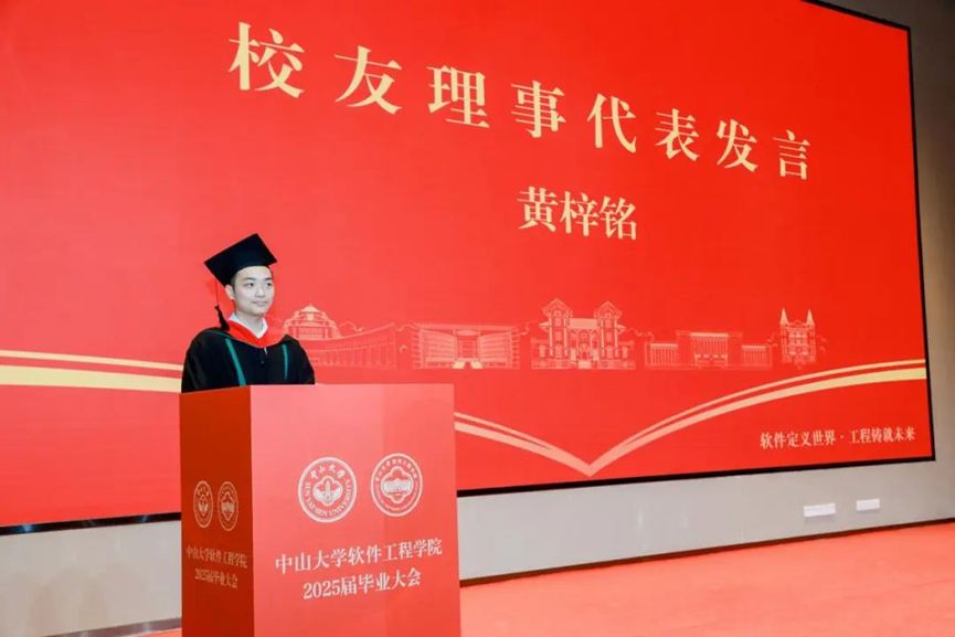 黄梓铭作为学院第二届校友理事代表发言。他认为同学们在学院的求学旅途中,学到的不止有软件技术,还有解决问题的能力、持续学习的热情和勇于担当的责任感。他指出学院校友理事会的意义在于连接彼此、互相支持、共同成长,并表示各位校友理事将继续为学院毕业生搭建沟通桥梁,比如由校友和在校生共同打造的学院自主信息交流平台“SSE-Market”,促进资源共享,助力职业发展。