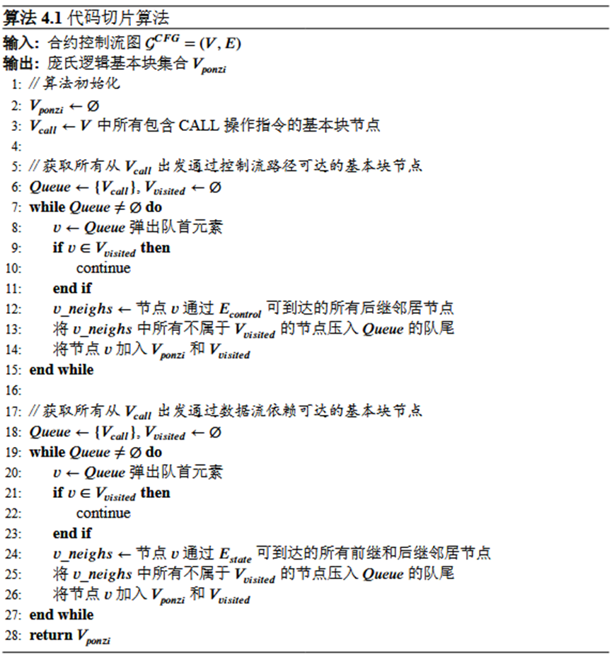 2. 为了对包含CALL操作指令的基本块进行控制流和数据流的可达性分析,从而提取与庞氏骗局逻辑相关的代码基本块,研究团队设计了一个算法(具体细节可从论文原文中了解):