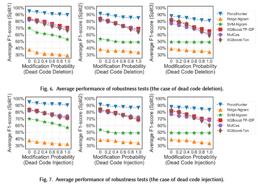 3. 在面对合约代码恶意篡改时PonziHunter在相同条件下表现出了更强的稳定性和鲁棒性,进一步验证了其在检测庞氏智能合约代码篡改样本方面的优越性。