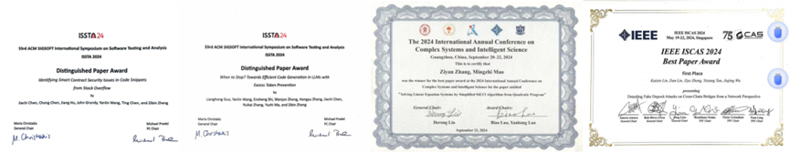 学院积极组织学生参加面向软件工程和人工智能知识应用领域竞赛,通过持续充实竞赛指导师资库,整合竞赛队伍支撑保障资源,建立以教师为牵引,学生为主体的竞赛指导机制。五年来,学院学生获得国际级、国家级、省部级科技创新竞赛奖项共100余项,其中包括第九届中国软件服务创新大赛一等奖、2024中国可信区块链安全攻防大赛冠军、第九届CCF中国数字服务大会服务计算创新大赛一等奖、第一届全国大学生“区块链+”应用大赛一等奖、第十六届全国大学生信息安全竞赛一等奖、第二届世界科学智能大赛一等奖等。