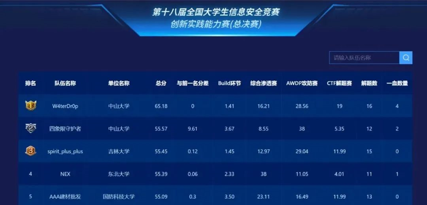 次日决战:次日赛事包含AWDP攻防对抗赛和CTF解题赛两个环节。W4terDr0p队伍在赛场上稳住优势,斩获CTF赛道全场最高分,展现出全面且顶尖的解题能力,同时AWDP环节也稳定发挥,综合积分排行逐渐稳居第一,成功夺得全国一等奖(冠军)。