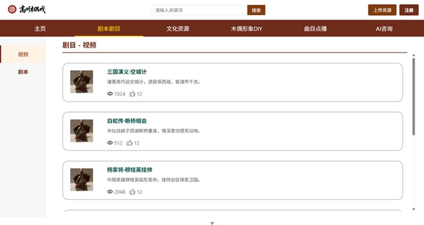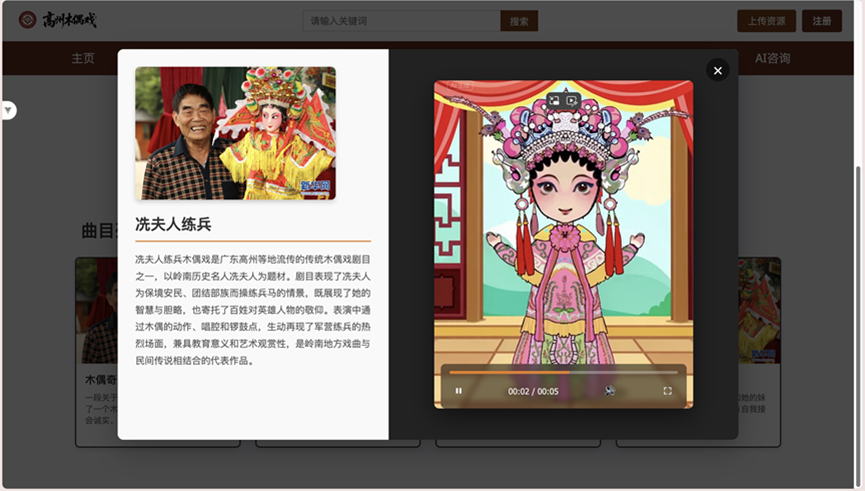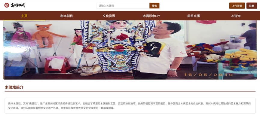 主页承担基础信息中枢” 的角色,系统梳理高州木偶戏的历史脉络(从明代起源到当代发展的关键节点)、艺术特色(杖头木偶造型、粤西白话唱腔、唱做念打” 表演技法)、代表性传承人(生平、技艺特点、代表剧目)等核心信息。既完成了木偶戏基础档案” 的数字化固化,也让大众快速建立清晰认知。