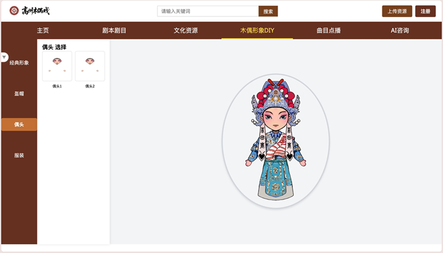 • 木偶动漫形象 DIY:人人都是木偶设计师。系统先对高州木偶经典形象进行组件化拆分,提取头部(发型、脸谱)、服饰(长袍、短褂、配饰)等元素,用户可自由搭配组件,DIY 专属木偶形象。