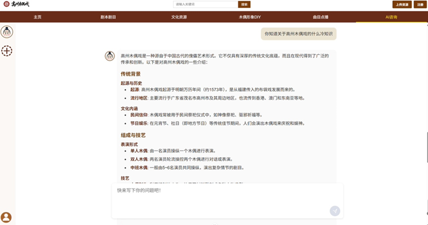 • 既是智能问答助手,也是个性化科普员 无论是普通爱好者还是研究者,都能快速获取知识,极大扩大了木偶戏的宣传覆盖面。