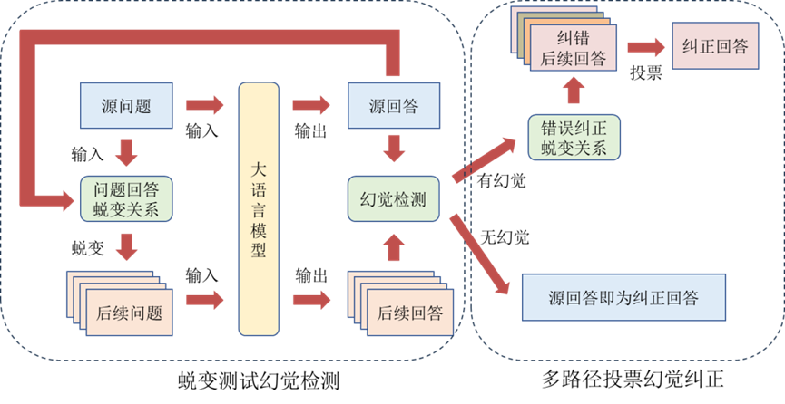 2)多路径投票幻觉纠正模块:基于复合蜕变规则构建多维验证网络,通过多数投票或语义聚类聚合实现自纠正。