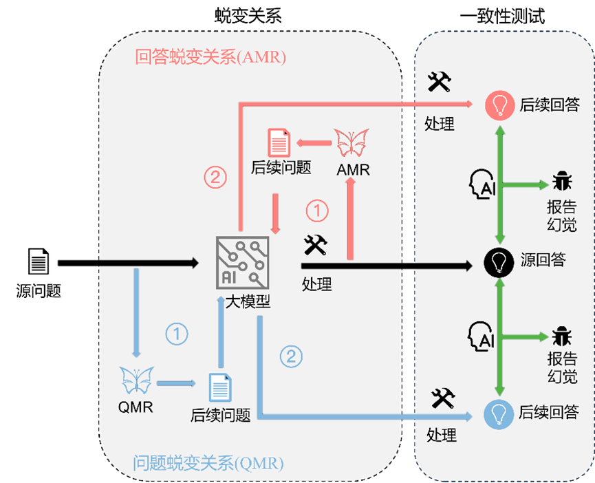 具体而言,在幻觉检测阶段,系统首先将源问题通过六类基础蜕变关系转化为后续问题,包括基于源问题的蜕变关系QMR和基于源回答的蜕变关系AMR
