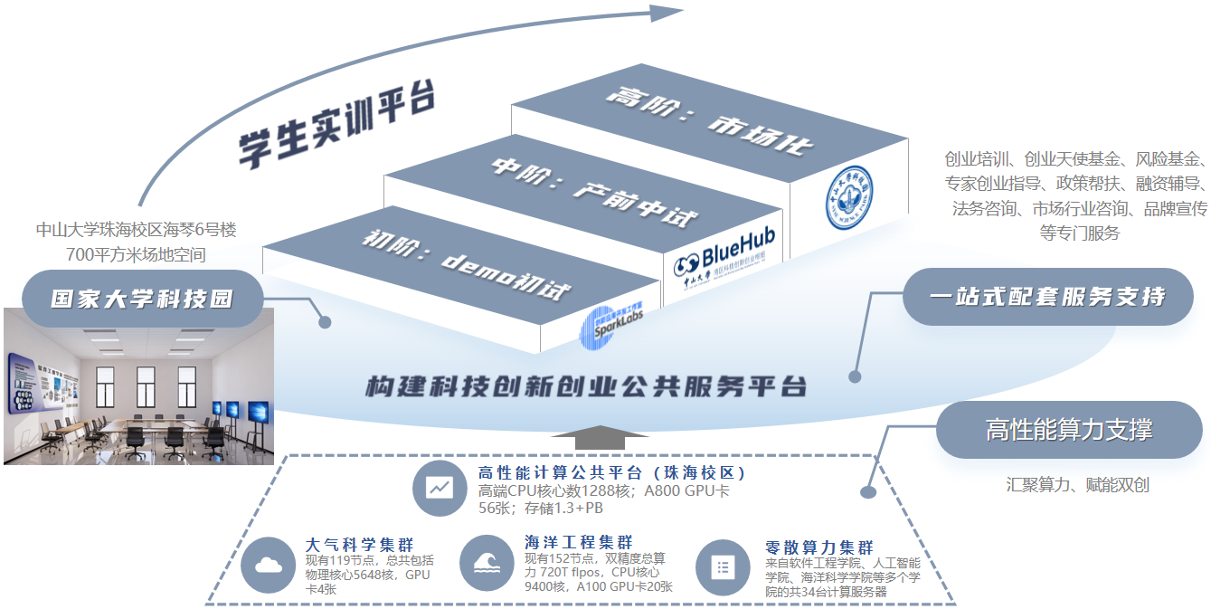 在产品市场化方面,依托学校人工智能研究院的高算力设施,以及国家大学科技园的孵化设施空间,着力为Blue Hub科创团队打造创业实训综合体。通过创业导师资源提供创业培训、专家创业指导、政策帮扶、融资辅导、市场行业咨询、品牌宣传等一站式配套服务支持,让技术成果向市场产品转化,培养科创型企业家。