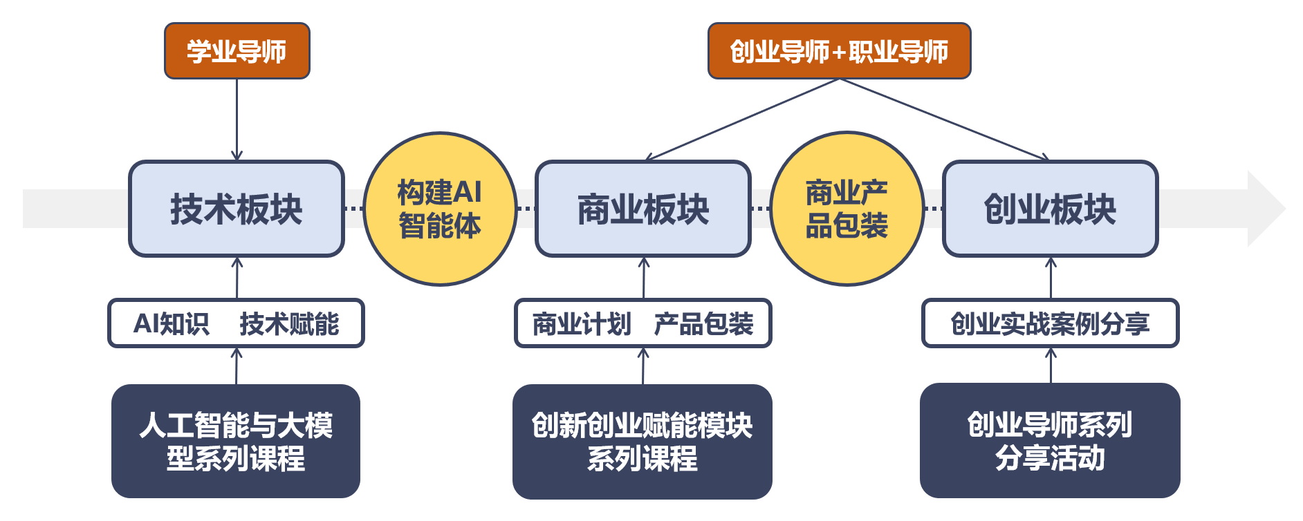 链路的起点是学生学习力、思想力、行动力的培育和提升。为此,Blue Hub设计了“大学生科创者计划”。由AI专业导师与工程师打造技术课程板块,通过闭环式训练让学生掌握构建AI智能体的技术能力。其次通过商业计划板块,由职业导师指导学员将AI技术转化为AI产品。在创业板块,通过创业导师“私董会”让学员深入掌握创业实战案例。Blue Hub科创班则采用项目制教学、社团化管理,让学员们以项目团队的方式,开展合作学习和探索实践,促进学生主动发展。